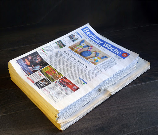 (The first, at the time still unconsciously, work made within a framework of simple rules- in this case the collection of a free weekly newspaper- evolving a certain time span and relating to a place. The work will, eventually, end when the pile reaches 179 cm in height or if I leave Berlin, thus rendering it impossible to continue. Update: since mid 2015 the distribution ceased without any previous notice.)