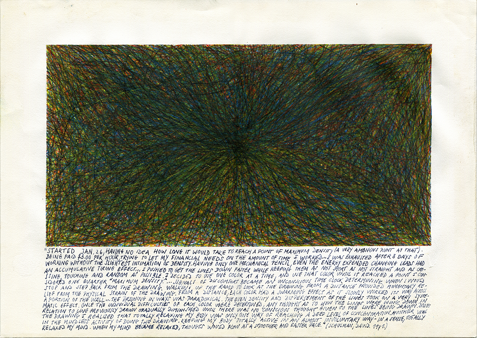 ”Started Jan. 26 having no idea how long it would take to reach a point of maximum density (a very ambiguous point at that). Being paid $3.00 per hour, trying to let my financial needs have little effect on the amount of time I worked… I was exhausted after 3 days of working without the slightest intimation of density. Having only one mechanical pencil, even the energy expended changing leads had an accumulative tiring effect… I pushed to get the lines down faster while keeping them as not short as not straight and as crossing, touching and random as possible. I decided to use one color at a time, and use that color until it reached a point I considered one quarter ‘Maximum Density.’… Signals of discomfort became an unconscious time clock determining when I would stop and step back from the drawing. Walking up the ramp to look at the drawing from a distance provided momentary relief from the physical strain of the drawing. From a distance, each color has a swarming effect as it slowly worked its way across a portion of the wall… The drawing in ways as paradoxical. The even density and dispersement of the lines took on a very systematic effect. Once the individual difficulties of each color were determined, any thought as to how the lines were going down in relation to line previously drawn gradually diminished until there was no conscious thought given to the lines being drawn. Doing the drawing I realized that totally relaxing my body was only one way of reaching a deep level of concentration. Another was the mindless activity of doing the drawing. Keeping my body totally active in an almost involuntary way-in a sense, totally relaxed my mind. When my mind become relaxed, thoughts would flow at a smoother and fast pace.”