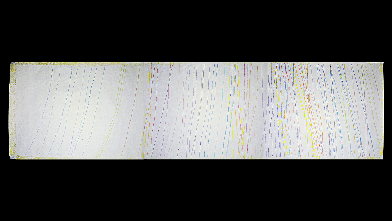(Charting the sunlight shadow cast on the wall for thirty days – the number of shades on a standard coloured pencils box. Each colour records one day.)