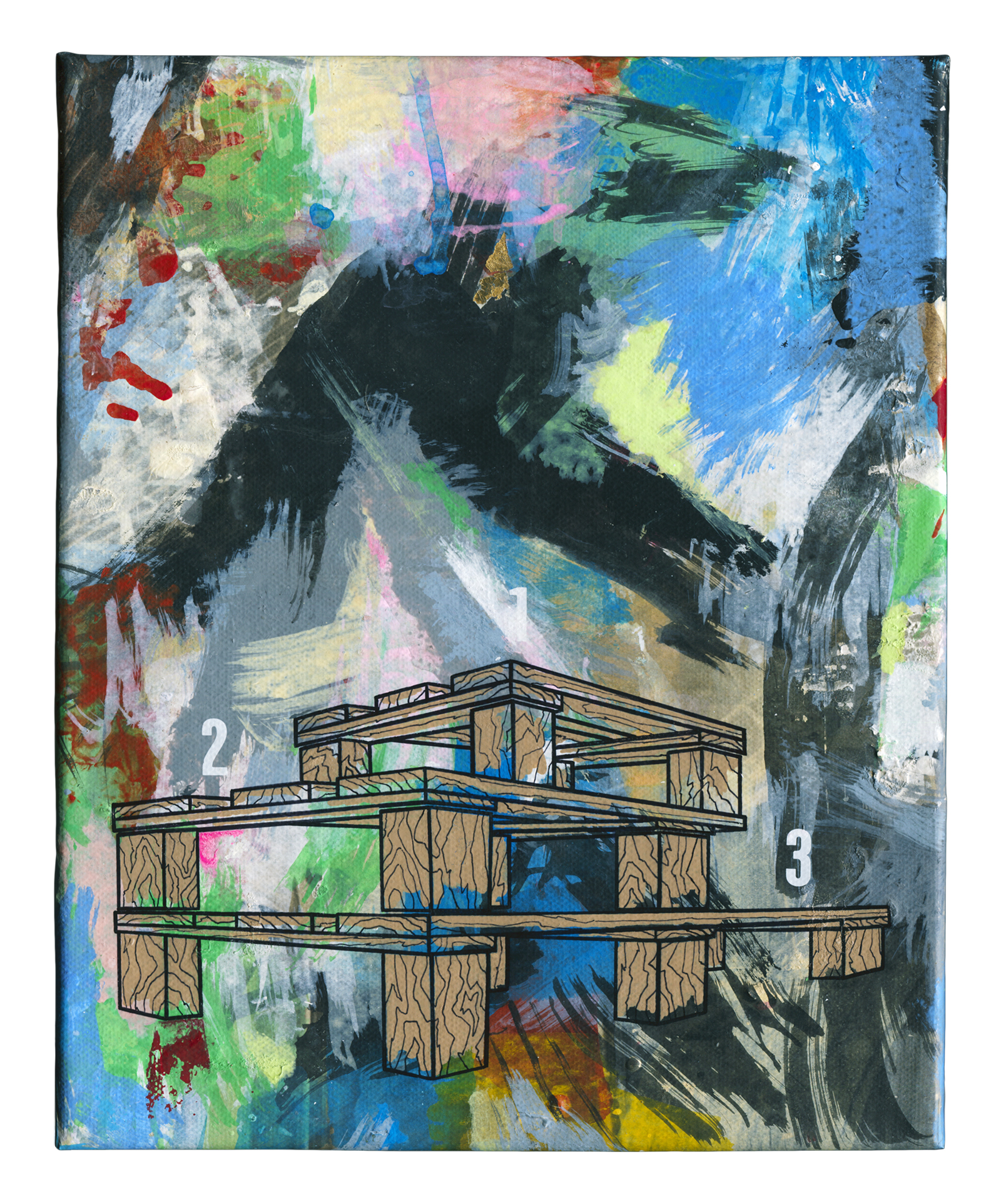 Painted paper, acrylic, synthetic resin spray on canvas