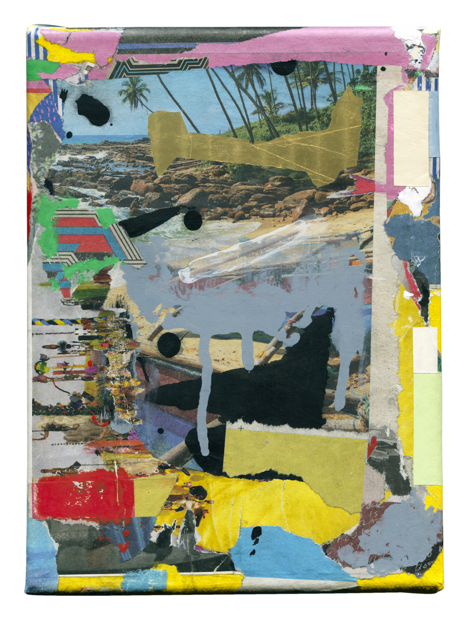 Painted paper, acrylic, permanent marker, transfer rub-on letters, golden foil on canvas