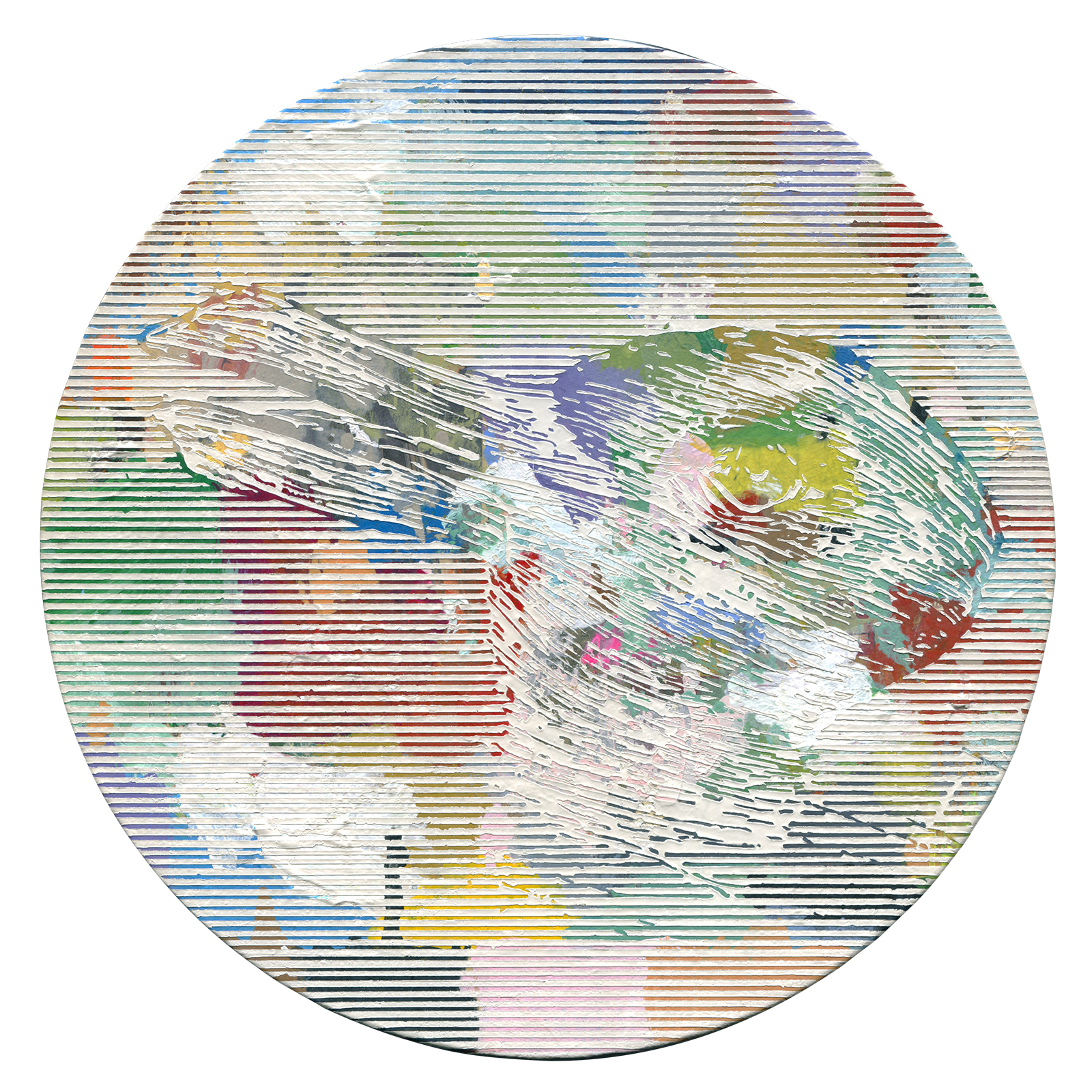Acrylic, permanent marker, coloured pencil, enamel paint, graphite on canvas